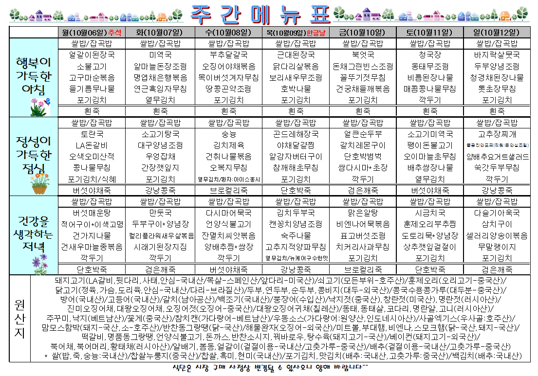 제목 | 주간식단표(25.10.06~25.10.12) |