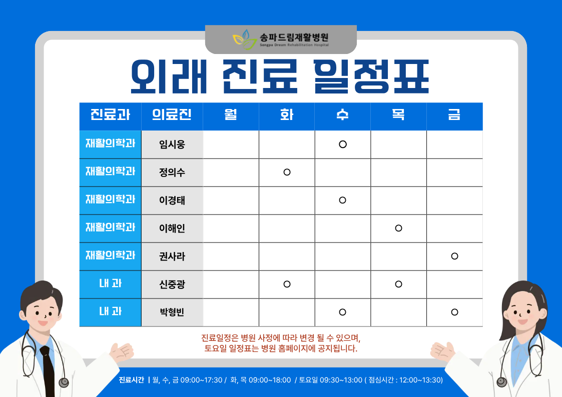 2026년 1월 1일부터 보다 원활한 진료를 위해 외래 진료 일정이 아래와 같이 운영됨을 안내드립니다.