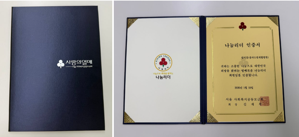 서울사회복지공동모금회로부터 ‘나눔리더 인증서’를 수여받았습니다.