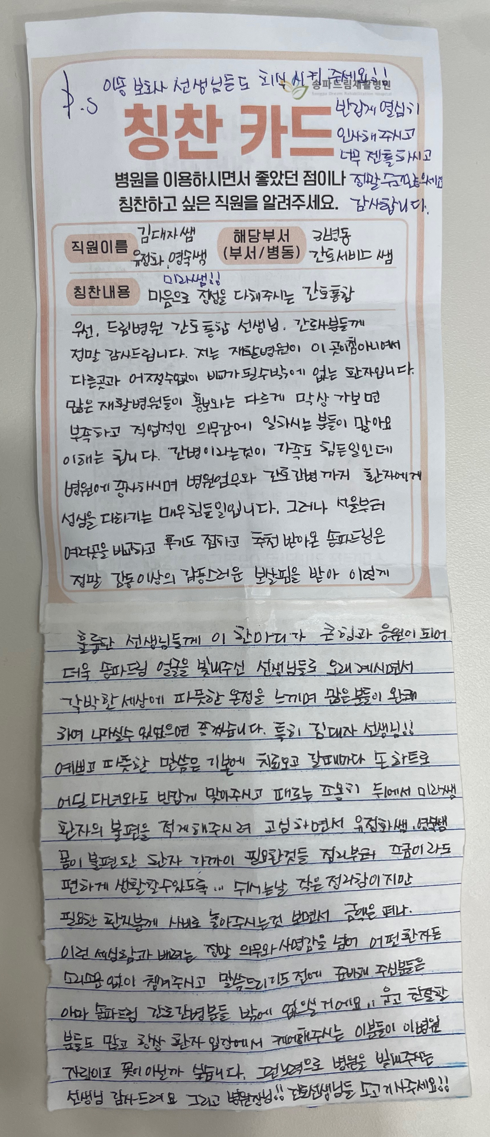 최근 접수된 한 칭찬카드는 단순한 칭찬을 넘어 마치 편지처럼 정성스럽게 작성된 글이었습니다.