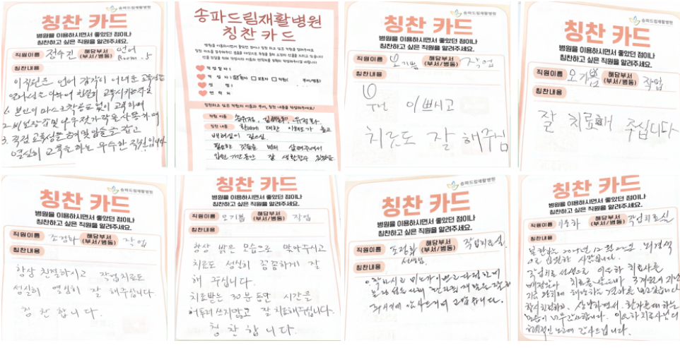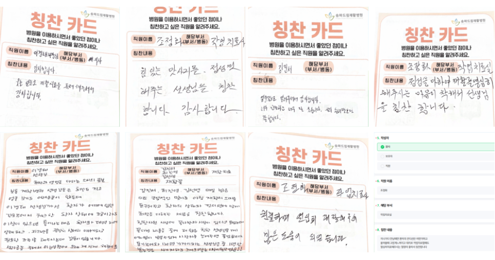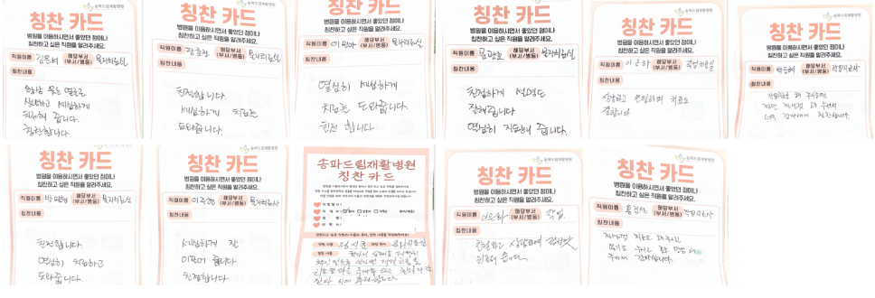 칭찬카드는 의료진과 직원들의 친절한 서비스, 치료 과정에서의 따뜻한 배려 등 다양한 격려가 담긴 소중한 기록입니다.
