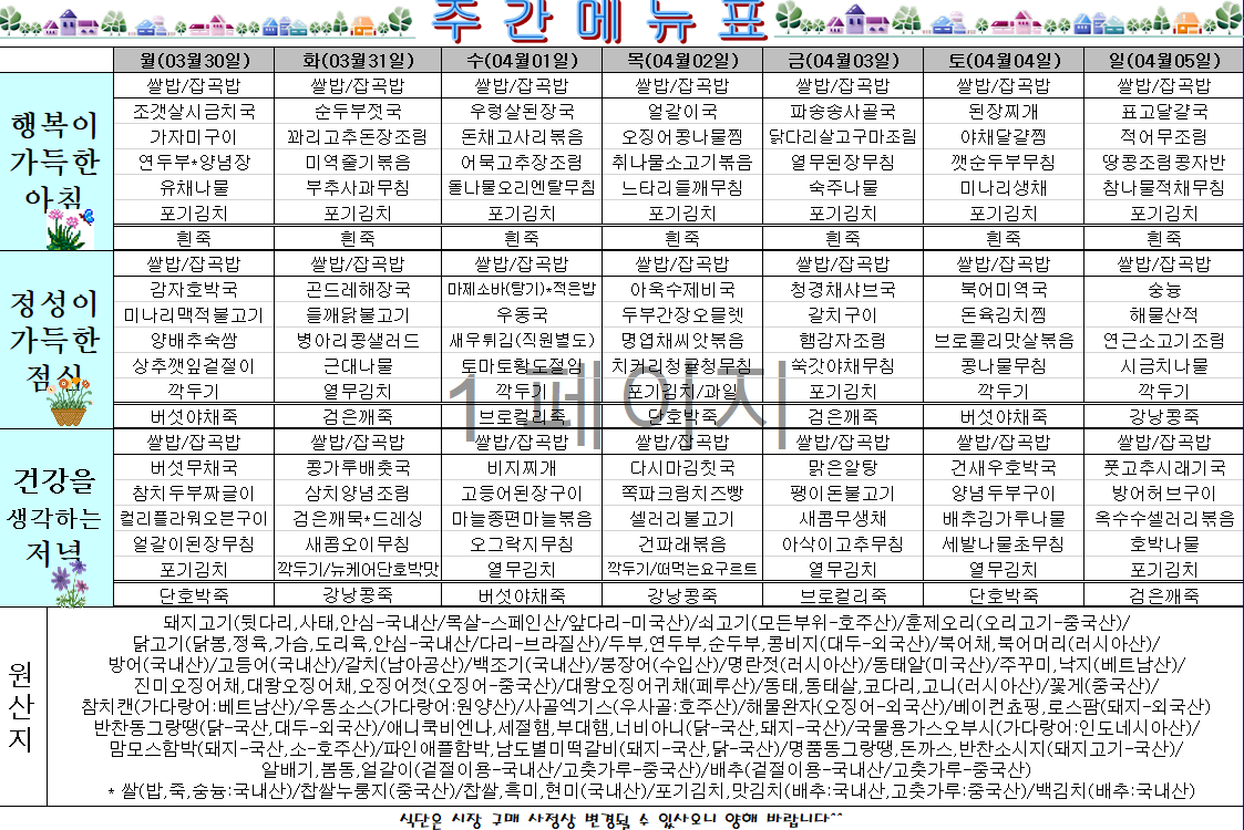 | 제목 | 주간식단표(26.03.30~26.04.05) |
