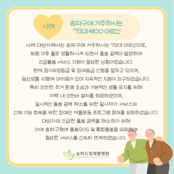 안녕하세요. 송파드림재활병원 사회사업실입니다.