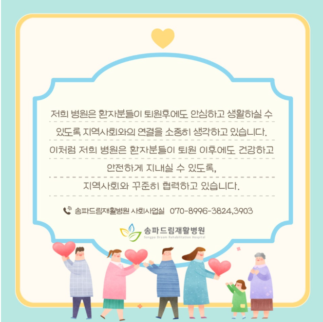 안녕하세요. 송파드림재활병원 사회사업실입니다.