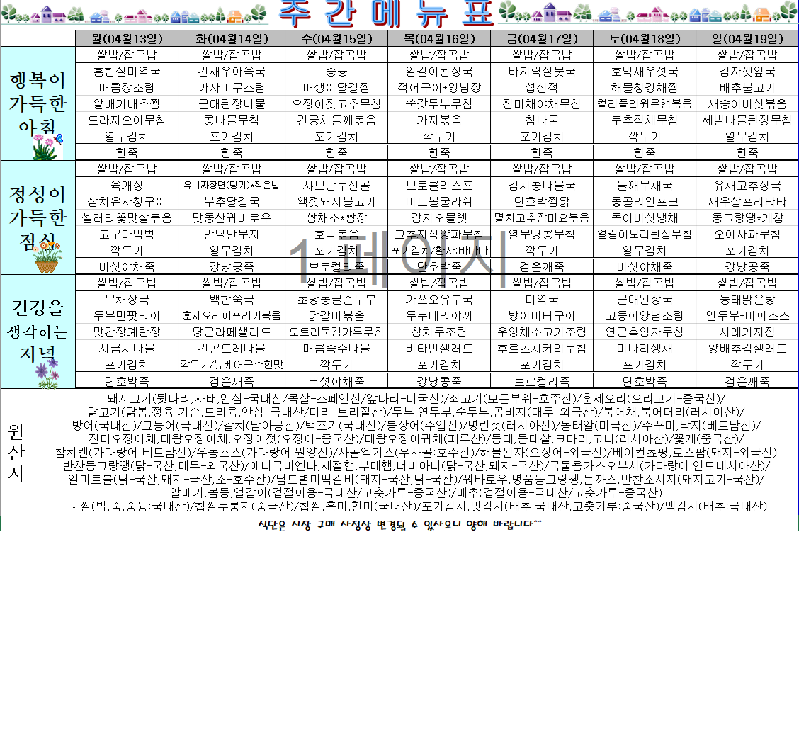 | 제목 | 주간식단표(26.04.13~26.04.19) |