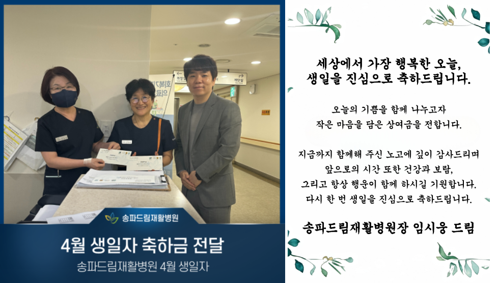 송파드림재활병원은 개원 초기부터 직원 한 분 한 분의 삶의 순간을 함께 축하하고 응원하고자,
