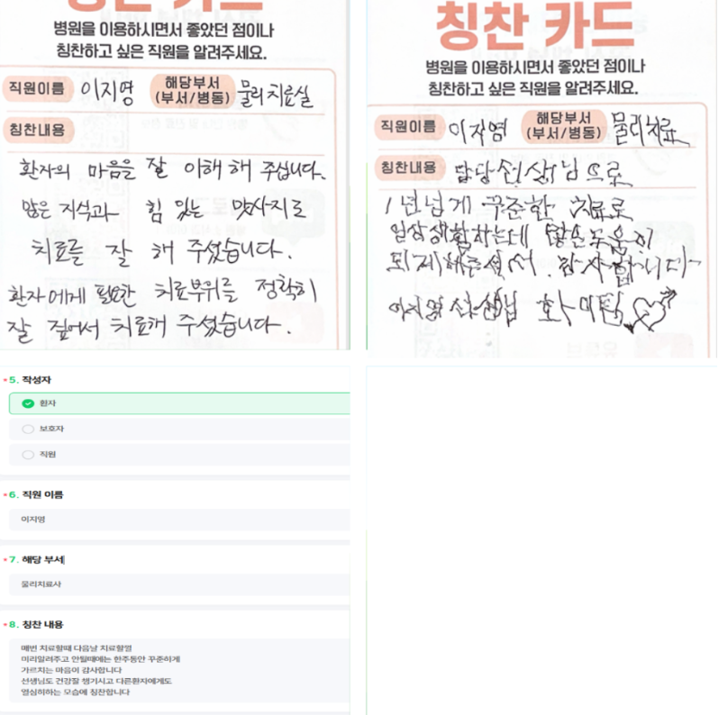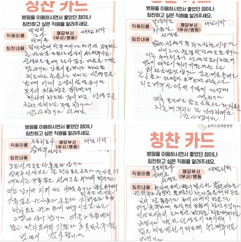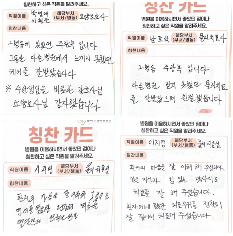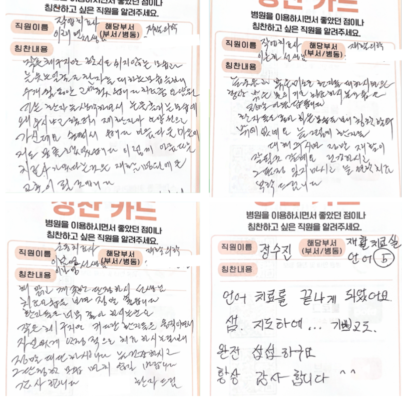 칭찬카드는 의료진과 직원들의 친절한 서비스, 치료 과정에서의 따뜻한 배려 등 다양한 격려가 담긴 소중한 기록입니다.
