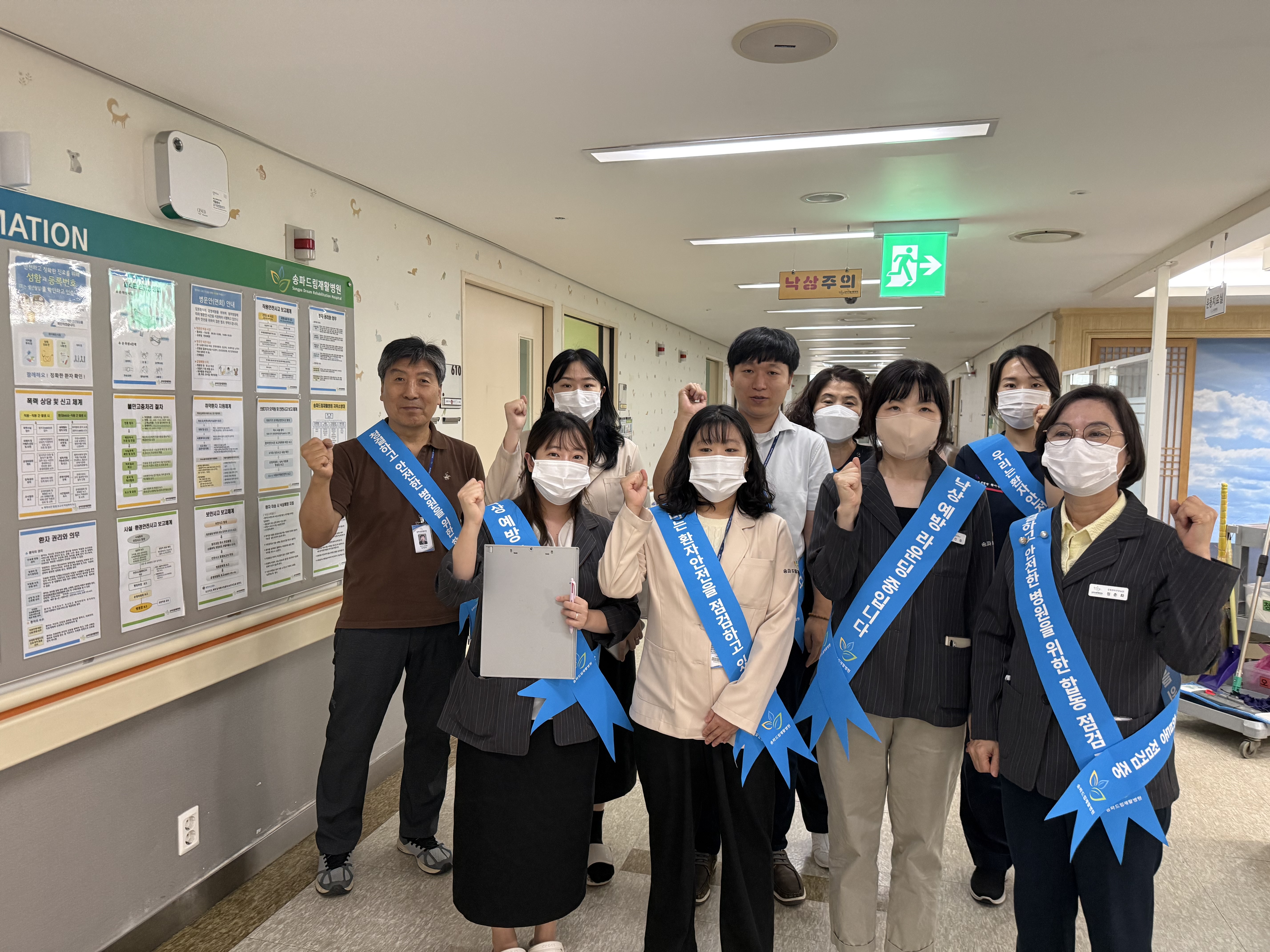 “낙상 예방 라운딩 중입니다”, “환자안전, 모두의 책임입니다” 등의 문구가 적힌 어깨띠를 착용하여