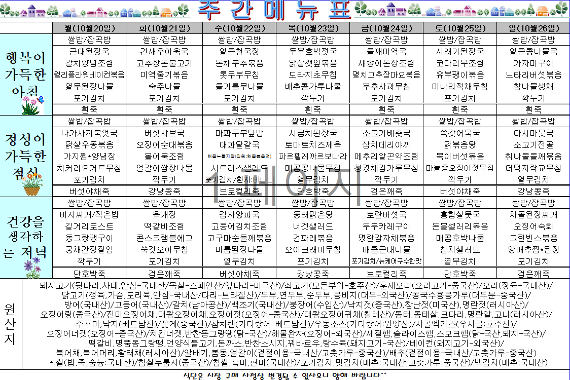 | 제목 | 주간식단표(25.10.20~25.10.26) |