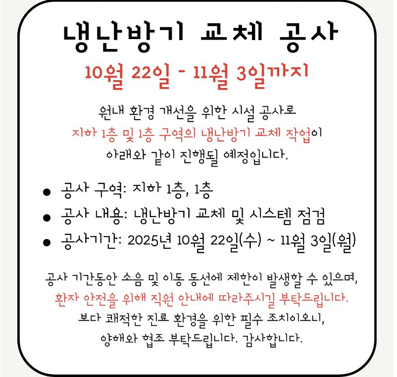 원내 환경 개선을 위한 시설 공사로 지하 1층 및 1층 구역의 냉난방기 교체 작업이