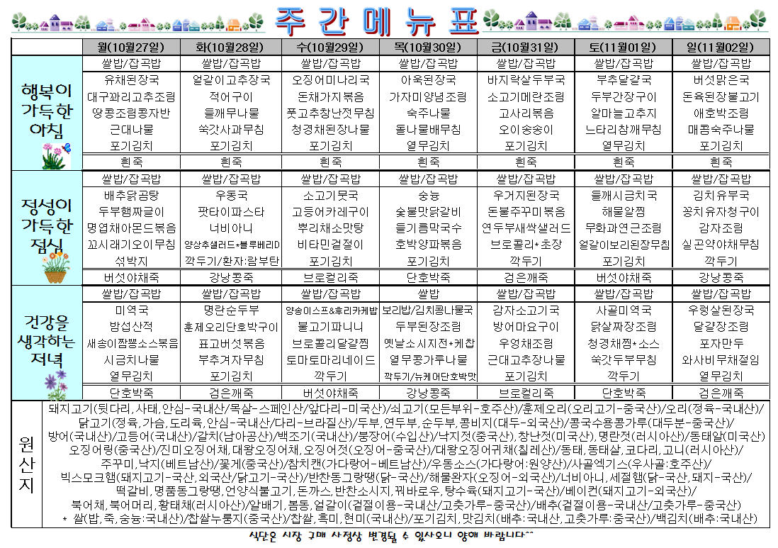 | 제목 | 주간식단표(25.10.27~25.11.02) |