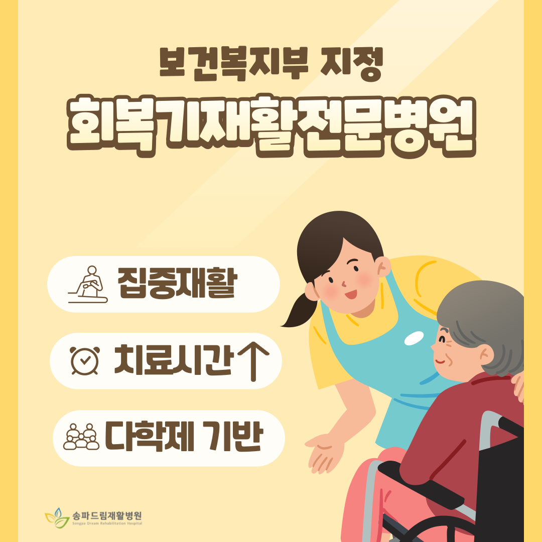 송파드림재활병원은 재활의료기관 제도에 맞춰 최적의 재활환경에서 회복 여정을 시작하실 수 있도록 돕겠습니다.