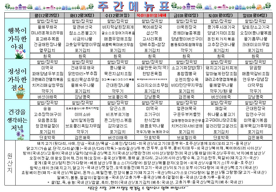 | 제목 | 주간식단표(25.12.29~26.01.04) |