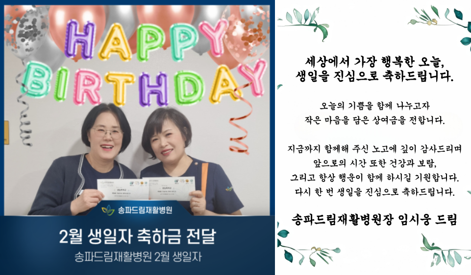 송파드림재활병원은 개원 초기부터 직원 한 분 한 분의 삶의 순간을 함께 축하하고 응원하고자,