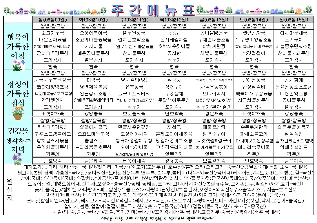 | 제목 | 주간식단표(26.03.09~26.03.15) |