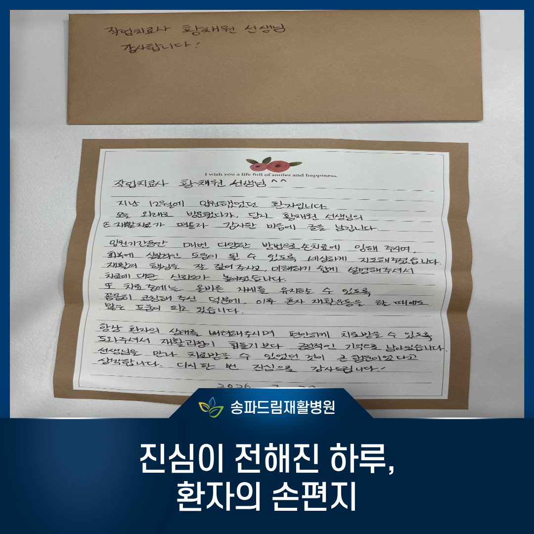 최근 저희 회복기 재활병원에 입원하셨던 한 환자분께서 정성스럽게 손편지를 보내주셨습니다.