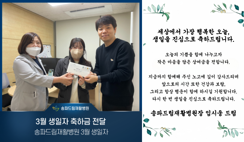 송파드림재활병원은 개원 초기부터 직원 한 분 한 분의 삶의 순간을 함께 축하하고 응원하고자,