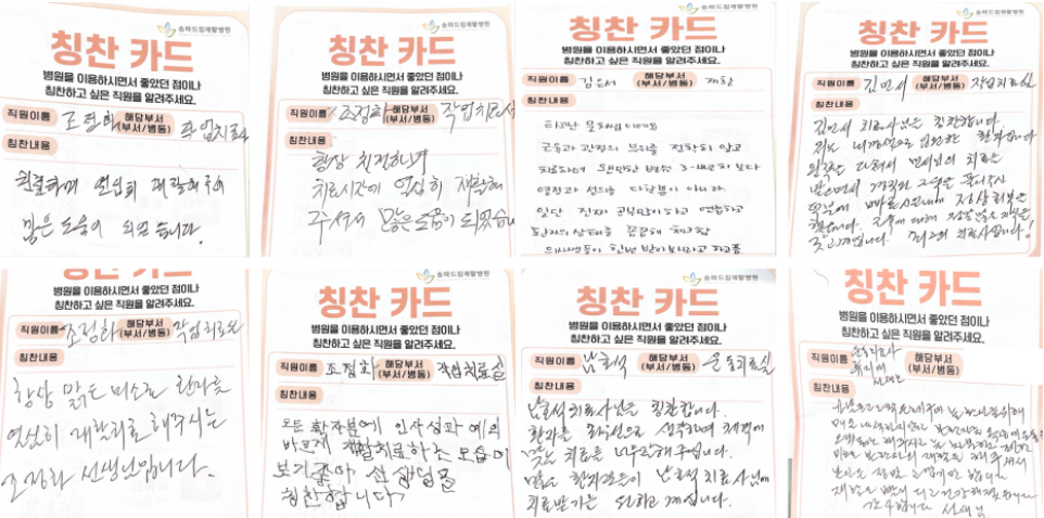 칭찬카드는 의료진과 직원들의 친절한 서비스, 치료 과정에서의 따뜻한 배려 등 다양한 격려가 담긴 소중한 기록입니다.