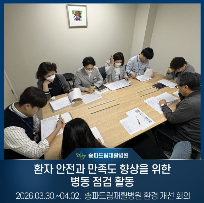 송파드림재활병원은 앞으로도 환자 중심의 의료서비스를 실천하기 위해 작은 부분까지 놓치지 않고 꾸준한 점검과 개선활동을 이어나가겠습니다.
