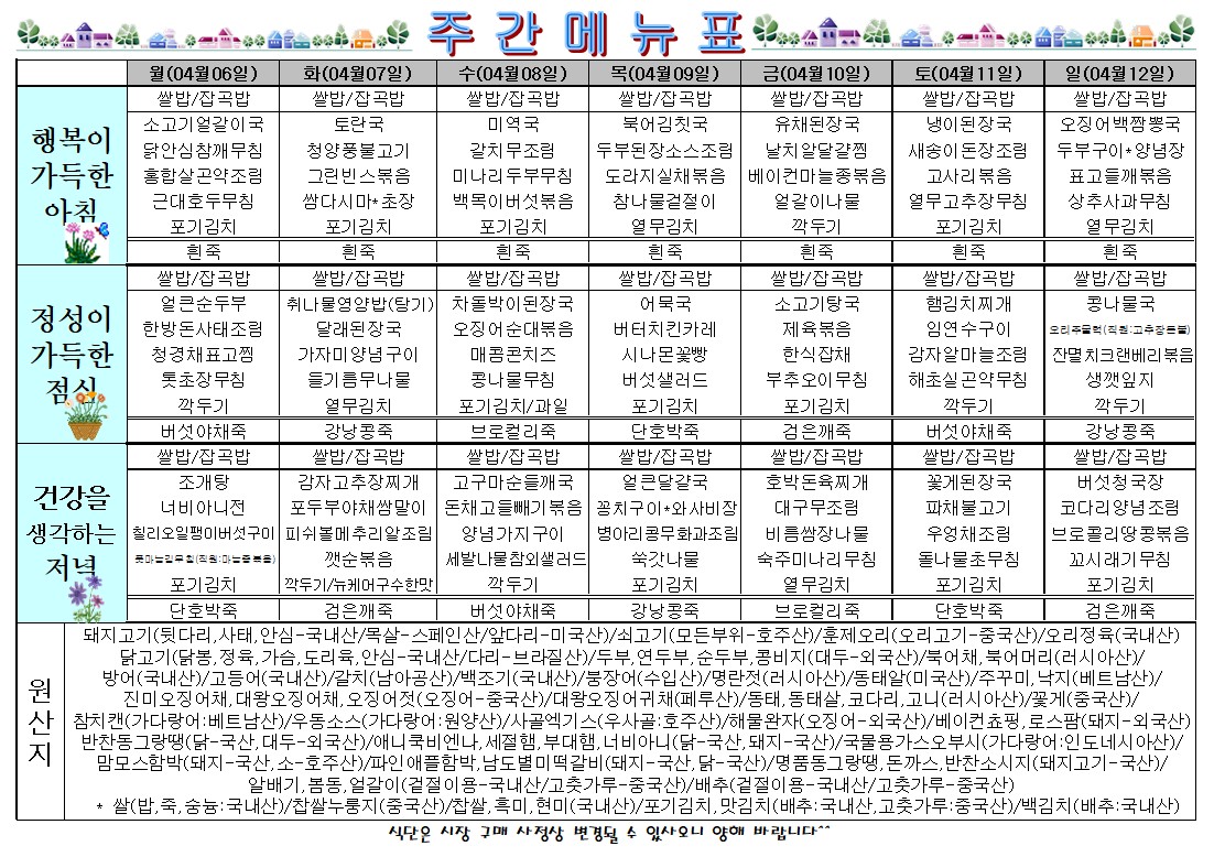 | 제목 | 주간식단표(26.04.06~26.04.12) |