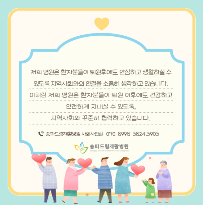 안녕하세요. 송파드림재활병원 사회사업실입니다.