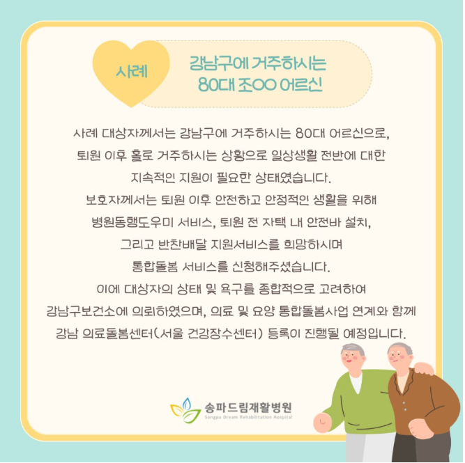 강남구보건소에 의뢰를 진행하였으며, 맞춤형 통합돌봄 서비스가 제공될 수 있도록 연계하였습니다.