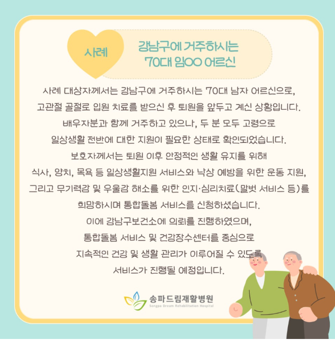 강남구보건소에 의뢰를 진행하였으며, 맞춤형 통합돌봄 서비스가 제공될 수 있도록 연계하였습니다.