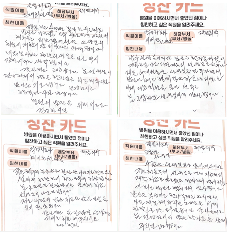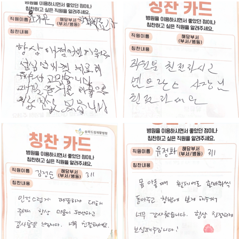 칭찬카드는 의료진과 직원들의 친절한 서비스, 치료 과정에서의 따뜻한 배려 등 다양한 격려가 담긴 소중한 기록입니다.